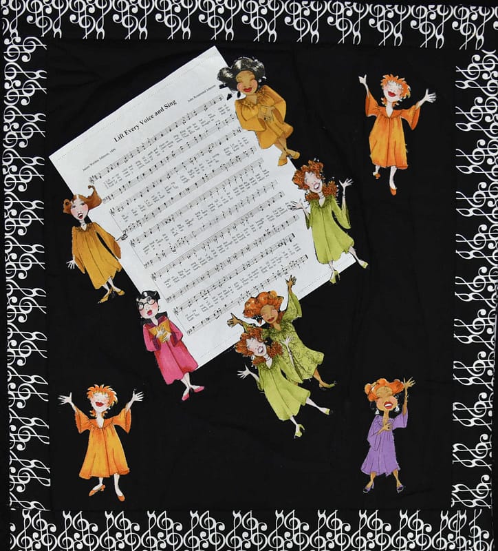 Description: James Weldon Johnson wrote the lyrics to “Lift Ev’ry Voice and Sing” in 1889 as a poem, and his brother, John Rosamond Johnson, set it to music. February 12, 1900, it was performed in Jacksonville, FL, by a chorus of 500 children in the segregated Stanton School where James Johnson was principal. It was part of a celebration of Lincoln’s birthday and Black History. “Lift Ev’ry Voice and Sing” has come to be known in the United States as the Black or Negro National Anthem. The song will be played before NFL games, starting September 2020. The fabric appliqué for this piece is from the Loralie collection titled “Sing it Sister.”