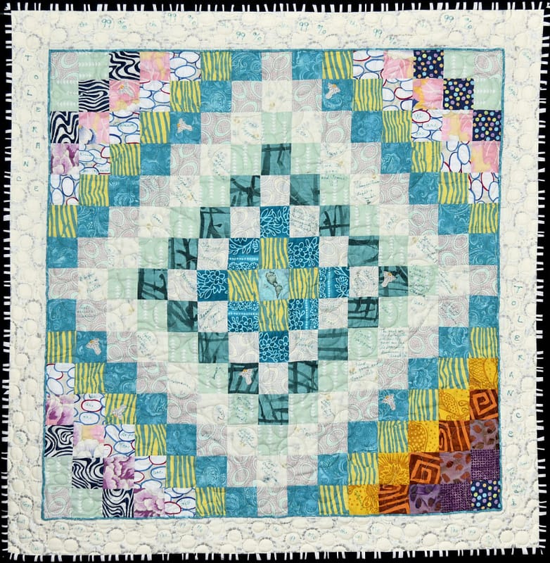 Description: The name of this quilt is a message that Pat believes “99%” of the people in the world are peaceful and peace loving, kind, and not prone to violence. Despite what we hear and see in the news media, if we send out thoughts and prayers to those who are so angry and troubled, we can start to change their anger from violence to peace. Pat has written many words of peace in the quilt and its borders. The backing fabric is printed with many words of peace, hope, and faith.