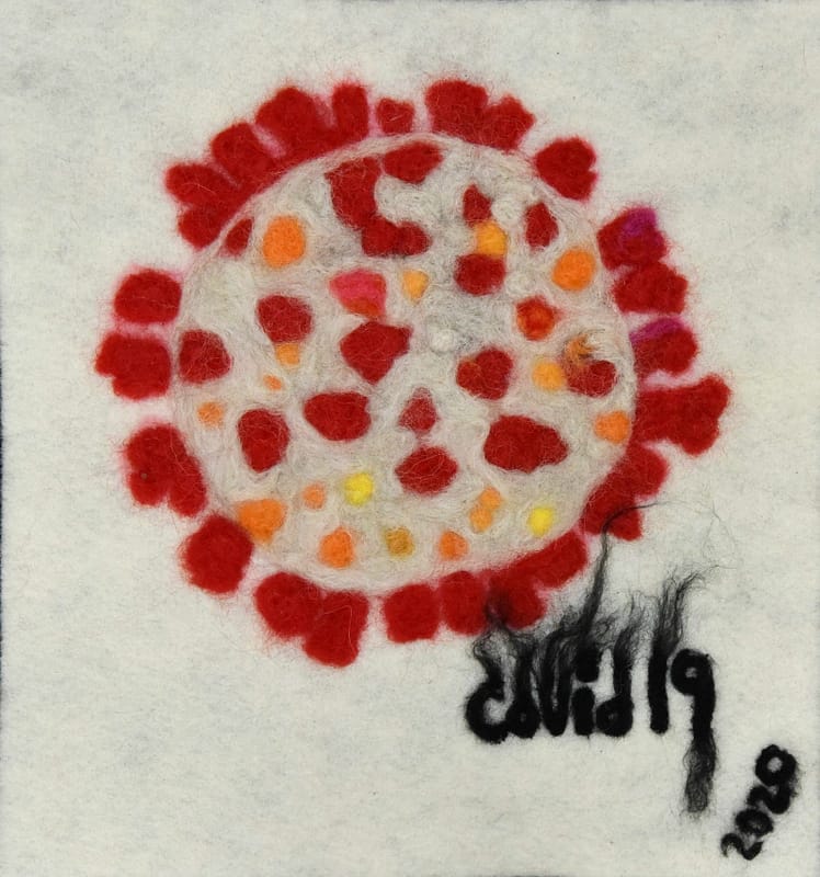 Mary created this piece to convey the devastating ravages of the Coronavirus. She felted 100% wool and wool roving. The word “COVID 19” on the right side of this piece demonstrates the spread of the virus. It does not discriminate.