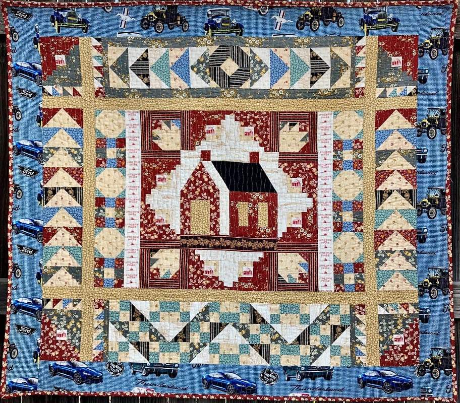 Description: The pattern for this quilt is by Linda Halpin. It features: Flying Geese, Dugout, Bear Paw, Log Cabin, School House, Nine Patch, Snowball, Trail of the Covered Wagon. The American television series "Little House on the Prairie" ran from 1974 to 1983. It followed the lives of the Ingalls, a farming family in Minnesota.