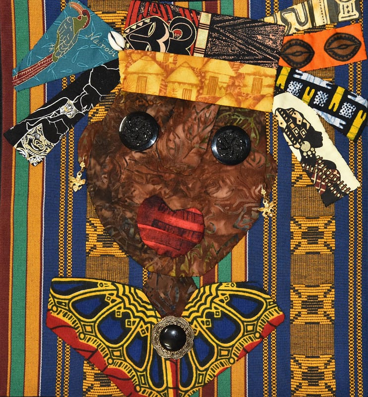 Description: As a lover of scraps and anything repurposed, I had African scraps in mind for my design. Using hand-appliqué on a woven African remnant, the leafy brown batik in her face represents the varied shades of skin we possess as African-American people. We have always been resourceful and able to take what others may believe is leftover or cast away and create something beautiful and useful. The hair I had imagined, did not work so I crowned her with a headdress, springing forth with fond memories of her African cultural heritage. Her eyes are wide open as she looks forward to a glorious future with the angels singing in her ears, “Keep on keeping on.”