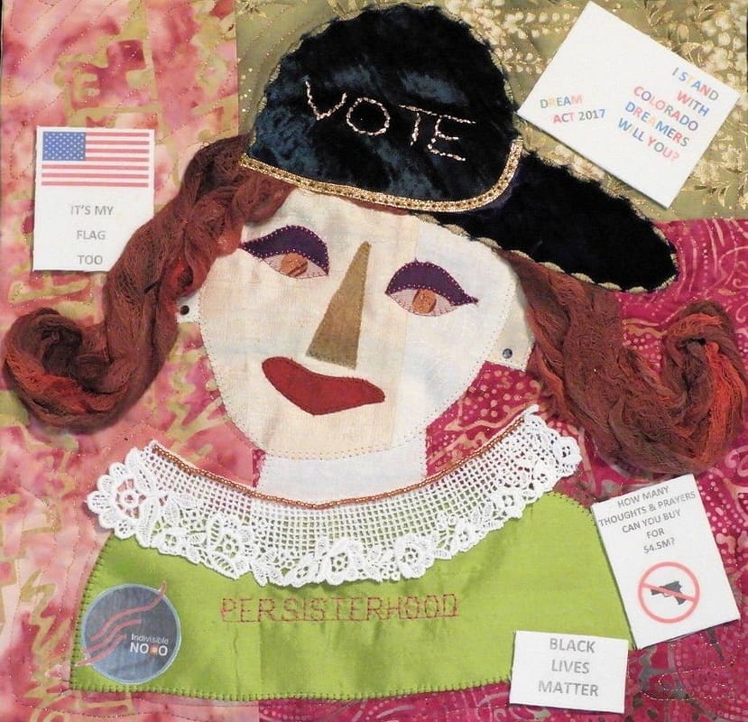 Description: My “self-portrait” was fun to make. The process took me outside my comfort zone, and I learned so much! My mother helped me come up with ideas, including the cheese cloth, which we had used to mop up paint after another project, for the hair as well as the lace collar in honor of RBG. The theme was my own. This piece is my one and only quilt that will ever mix my activism with quilting (it was hard to include a gun on a quilt). Activism comes from anger and quilting is a solace. Indivisible NOCO is a group I started in November of 2016. A friend gave me a “Vote 2020” hat that I wore every day for the two months up through Election Day. “Persisterhood” is a meaningful t-shirt that two girlfriends and I bought together. The signs are copies of real signs, just four of the many made between 2017-2020. My first was the flag sign, which I carried at the Women’s March in D.C. in 2017, and the last was the BLM sign that hung in my front yard the summer and fall of 2020. I left the name of our former Senator off the other two signs because I helped make him insignificant.