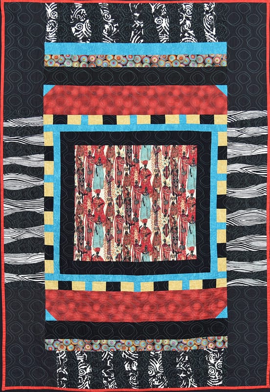 Description: The center of this quilt is fabric, not a panel. I loved the colors in the quilt, so I just added simple borders in various patterns to complement the center piece. The outer border is odd shaped pieces sewn into black fabric. This was fun to make and shows how simple things can be made into a quilt. My goal is always to give my quilts away to some deserving person, but… with this one, I could not part, so it is in the “mine” collection.
