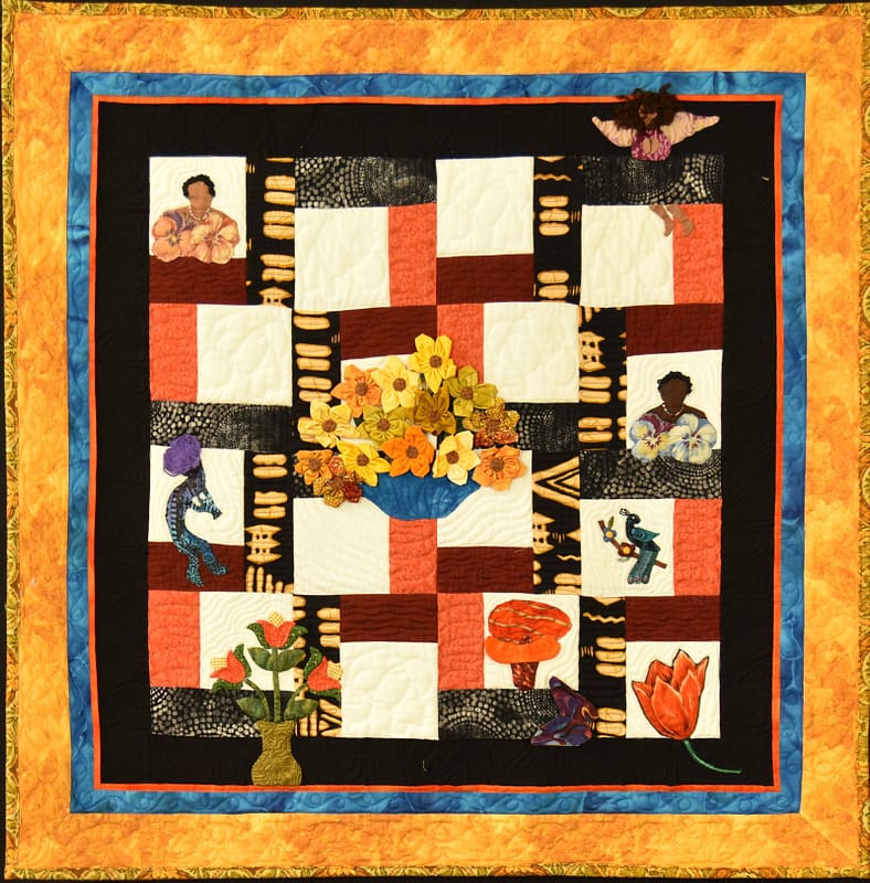 Description: This piece was inspired by quilt finds - at yard sales, Flea Markets, Thrift Stores, or on a table in the back of the room after Quilt Guild Meetings - which offers a little of this and a little of that. Such echoes from the past provide an opportunity to re-envision the idea, to rekindle the love…for quilting. I have re-envisioned what I have entitled: “Africa Abandoned” and then I turn it over to my favorite quilter to add “magical stitches.”