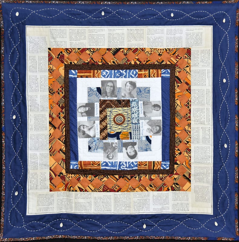I fashioned the center square with the women’s photos and African prints; Brenda Ames added the blue and African print pieced border; Marcia Walker sewed the brown and Seminole pieced border; Karen von Phul created the newsprint history of the women; Netta Toll completed the square with a navy border; I added the white hand stitching and cowrie shells.