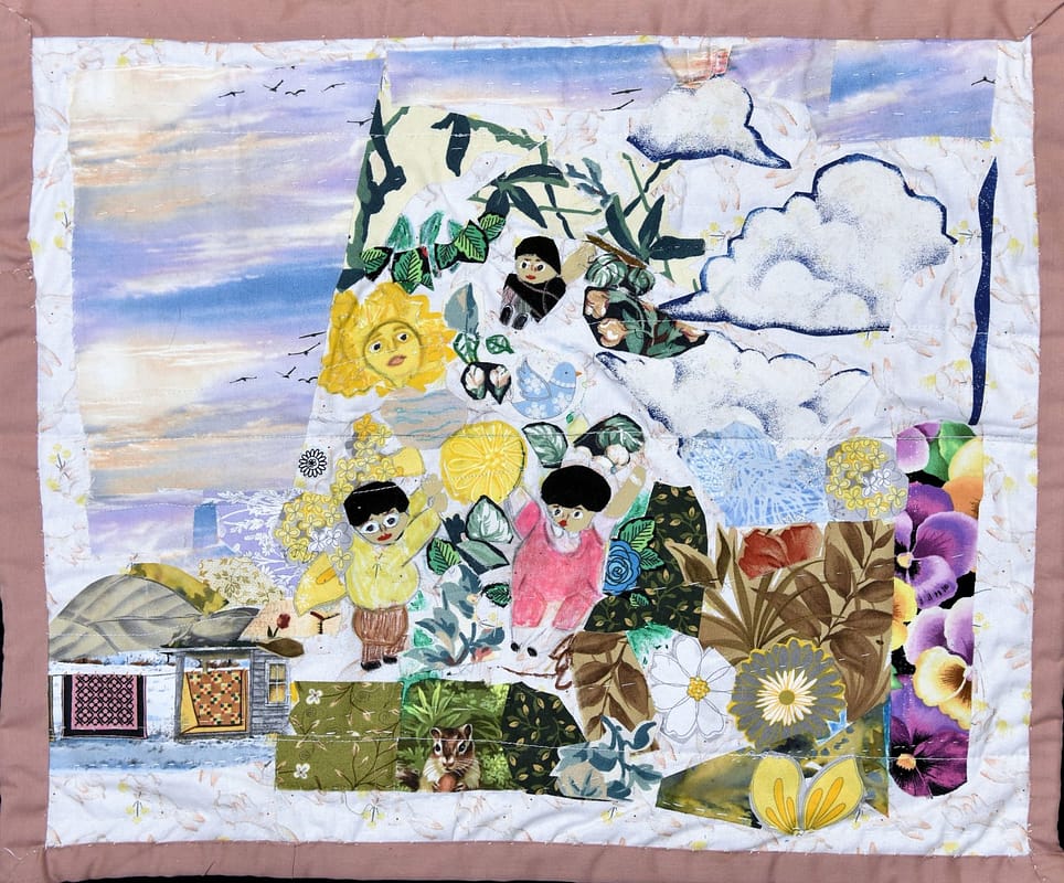 Description: I’ve often thought of how carefree I was as a child. We played and ran freely in my small town of Del Norte, CO. My grandmother, mother and aunts called us Changitos because we got into everything and climbed everything. Having 9 kids, mom did laundry every single Monday, Wednesday, and Friday. We had chores after school which included taking the laundry from the clothesline, to folding and ironing the clothes. The pink house we lived in always had kids, flowers, cats, and dogs. We spent a lot of time at our Aunts and Grandma’s place where we were surrounded by trees, rivers, and a swamp. I have many memories of lying on the lawn looking up at the sky and the clouds or the stars in the dark clear sky. There were so many near deaths because we were “cabritos” (little goats/kids”), but by the Grace of God, most of us came out with only physical scars. This quilt details some of what we were surrounded by growing up. I miss the smell of clothes hanging from the line. I miss all the flowers mom had and those we ate. I’ve been craving, “quelites.” I don’t even know the English name, but it might be “wild spinach.”