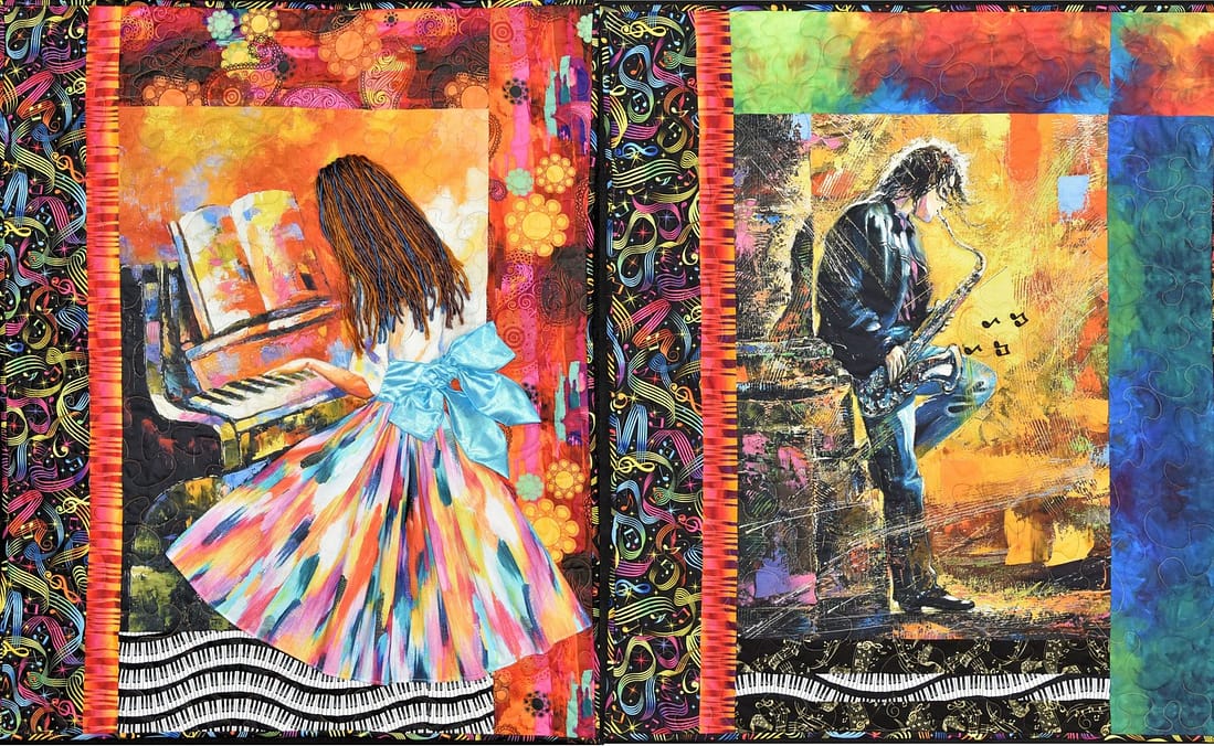 Description: 2020 was an unbelievable year! There were cancellations of everything, even schools and churches. The only thing open seemed to be hospitals and grocery stores, and there were restrictions for going to them. The cancelation that affected me the most was concerts. Live music. Live jazz music. Music that can reach all the way to your heart and soul. I was crushed. So, when I saw these panels online, I knew that I had to get them and quilt them. This diptych gave me something to do until my kind of music lives again.