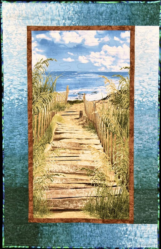 Description: This quilt is a reminder of the many fun times our family spent with the Myers and Nash families at Point Clark, Ontario, Canada. Our family summer visits began in the early 70’s when we were neighbors in Detroit, MI, and the visits continued until last year (2020) when the Covid 19 pandemic began. Access to Canada by Americans was not allowed. It is a panel with a scene that reminds me of the view from a window in their cottage that faces Lake Huron. This quilt is dedicated to the memory of Lucile Nash Myers.