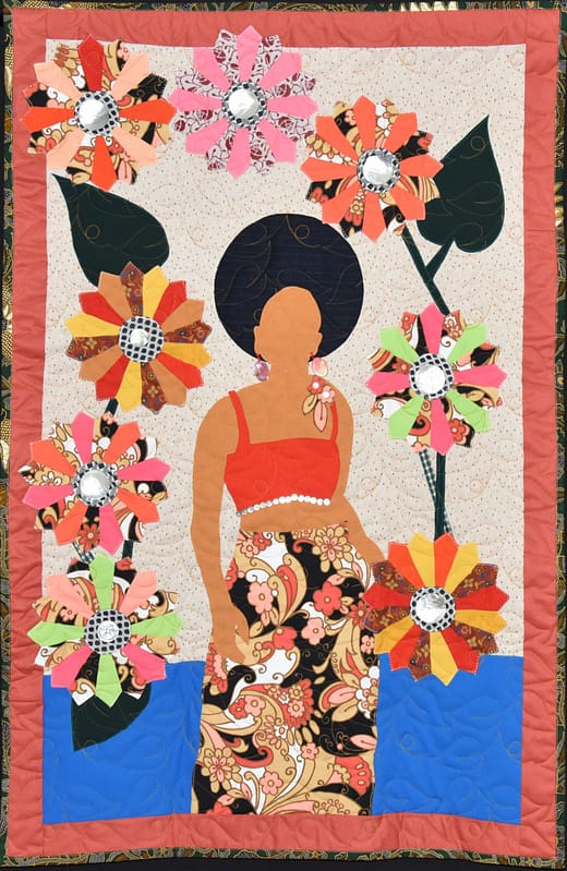 Description: Look at that queen strutting her flower-power maxi skirt in her Dresden Garden. It is a day to let the sunshine in, make love not war, hop aboard the friendship train, and just be groovy! Oh, things ain’t what they used to be, sweet memories from the 70’s. The music, the friendships, the dances, the hair dos, the platform shoes, fringed vests, ponchos, and the ever so popular polyester. I was given a box of polyester double-knit fabric from a beautiful, generous lady, Mrs. Sims in January 2020. She wondered if I could use any of it. At first glance, I loved the colors, but I was accustomed to using 100% cotton for my quilts unless it was for a crazy quilt. As I thought about it, my mind went back to the 1970’s, a very special, enjoyable time in my life. I enjoyed the “look” of the 70’s, the music of the 70’s, Soul Train, high school, the various hair styles, the Youth Unlimited Community Christian Club where we experienced singing Gospel music, theatre, traveling, Bible Study, retreats, just a whole lot of fun, friends, family, and fellowship. Our dresses and jumpsuits were made of the royal blue used for the flowerpots. This may be the beginning of a series as there is so much to learn about polyester. Stay tuned.