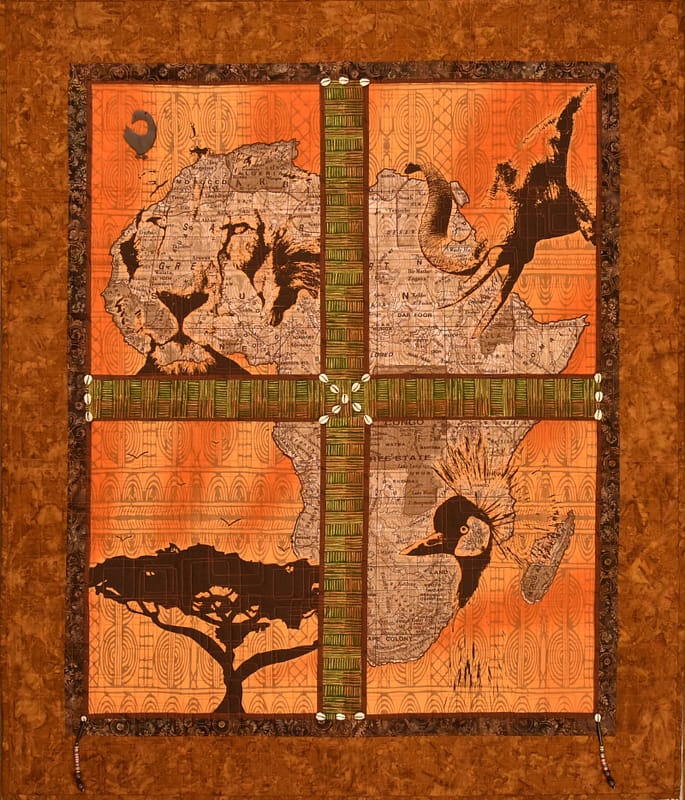 Description: Africa was a panel that I divided into four blocks and added sashing around the blocks. I used cowry shells to show connectivity between Africa and the animals. I included beads to continue that connection with people from Africa.