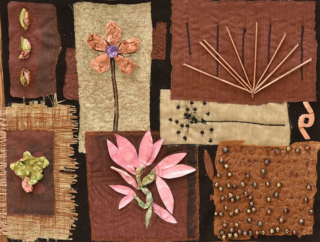 Description: This was a challenge in my critique group. We were given a piece of upholstery fabric with the images on it. We were challenged to do something with this piece on a felt backing finished 18"x14". I used Tyvek for the flower, sprayed pebbles copper, and wrapped Tyvek around them, displaying them as pods. I thread painted the dandelions. The copper irrigation piece is to act like water. The beads are to represent seeds. This challenge was out of my comfort zone, but I am glad I did it because I learned some new concepts.