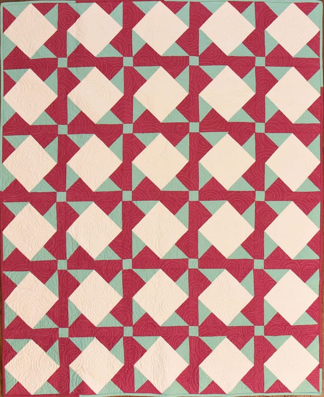 Description: I designed this quilt for a 2021 holiday book, Merry and Bright Quilts. All patterns were made by designers who met through a pattern writing class. We formed an online support group to promote each other’s new businesses and decided it would be fun to publish a book of holiday quilt projects. Pivot and Twirl was my contribution.