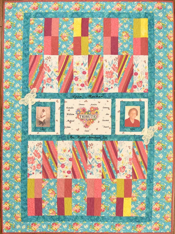 Description: This quilt features our mother, Mrs. Mattie Armstead Lee. I used hand stitching, machine stitching and appliqué for construction. The eight rectangular flowered blocks on a white background as well as the “Tribute” block in the center of the quilt are made from one of our mother’s bath robes. Unfortunately, our mother passed away on March 14, 2016, in Mobile, Alabama. We do all we can to obey her admonishment to us--” Y’all better stick together!” My siblings and I will pass the quilt around to each other just to help keep our Mother’s memory alive.