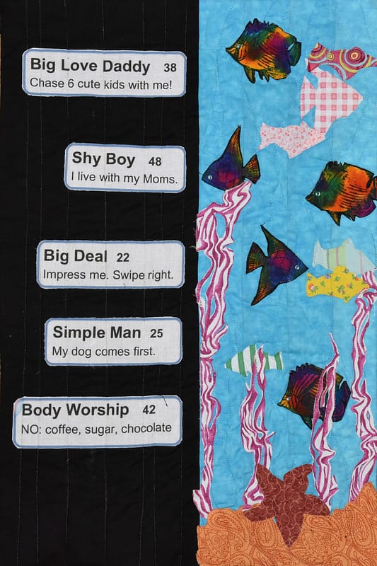 Description: Humans can't be the only species searching for true love. Check out these Fish Tinder profiles and consider: swipe left? Or right? Cotton fabrics from Wa Shonaji Scrap Challenge Bag. Printed fabric fused and appliquéd to Kona Bay Black.