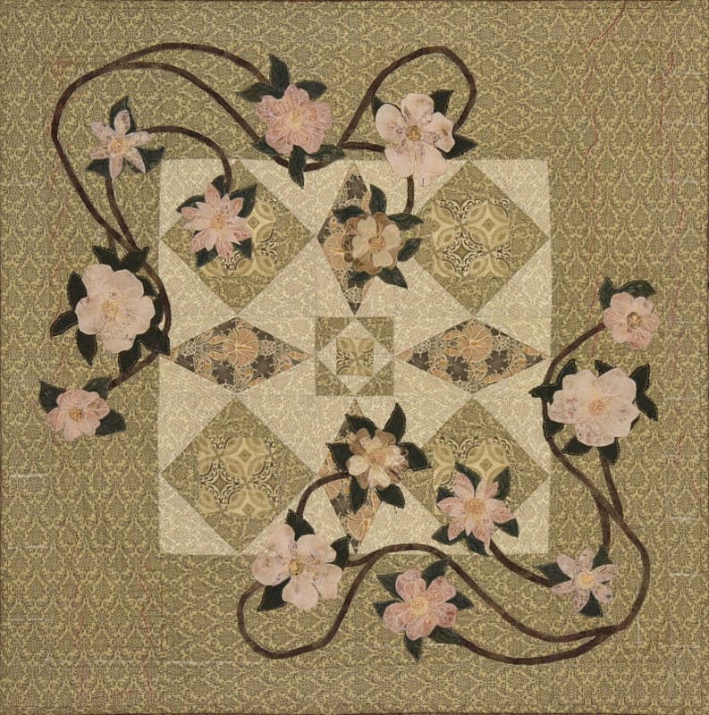 Description: This quilt is a family collaboration. My Dad, Stuart Lynn, designed the flowers and vines for my Mom, Barbara Lynn, to appliqué. She basted the piece with red thread for quilting when she became bedridden. Mom asked me to finish some of her projects including this quilt. It embodied so much of my mother’s style, talent, and handiwork, and I did not want to do anything to take that away including the red basting thread. As I quilted, I heard her voice: “loosen up,” “no one will notice the imperfections,” “you do such beautiful work.” I’m unimaginably sad that I cannot show it to Mom. I left some of the red basting in the quilt. I will remove it one day, but for now, I am still not ready. “My mother sewed the foundation. All I have to do now is thread my own needle.” Paraphrased from a statement by Loretta Pettway Bennett, Gee’s Bend Alabama