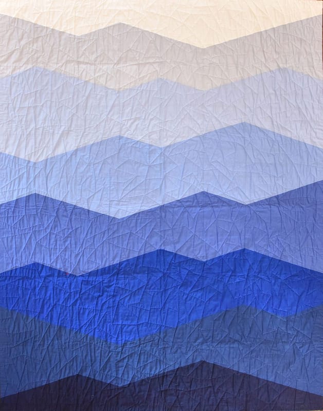Description: My first daughter and her husband chose to make their life together in Colorado. Sarah was raised on the East Coast, on Long Island Sound. While she still loves and misses the beach and the ocean, she has formed a strong connection with the Colorado Rockies. She asked for this quilt for her office, which doesn’t have a mountain view window. That was at the beginning of the pandemic, and she has worked at home since! Soon, Sarah will return to her office, and we will hang “her Rockies.” We have very different tastes, so I appreciate her desire to hang a quilt that I made, strengthening another connection.