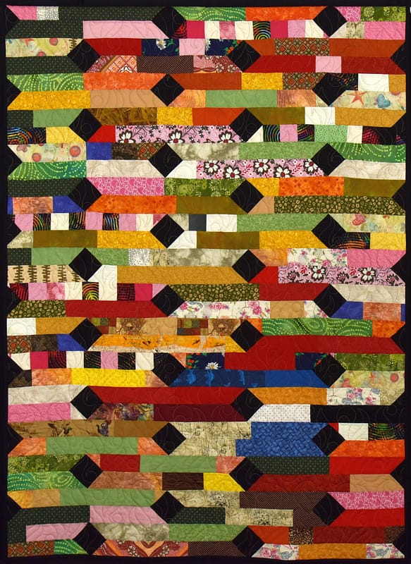 Description: During the summer of 2022, I traveled to CA to connect with a long-time friend and fellow quilt buddy. It was a small group retreat to work on "Mrs. Miller's Apprentice", a pattern we both purchased during COVID lockdown. Afterwards, I made the annual trek to the East Coast to visit family and friends in VA, DC, MD, and NC. This was a month-long connection. These valued connections to family and friends are represented by the diamonds in this piece. Each joining together leftover scraps from past quilts, donated scraps that memorialize fellow piecers and their quilts, as well, our beloved and talented quilters.