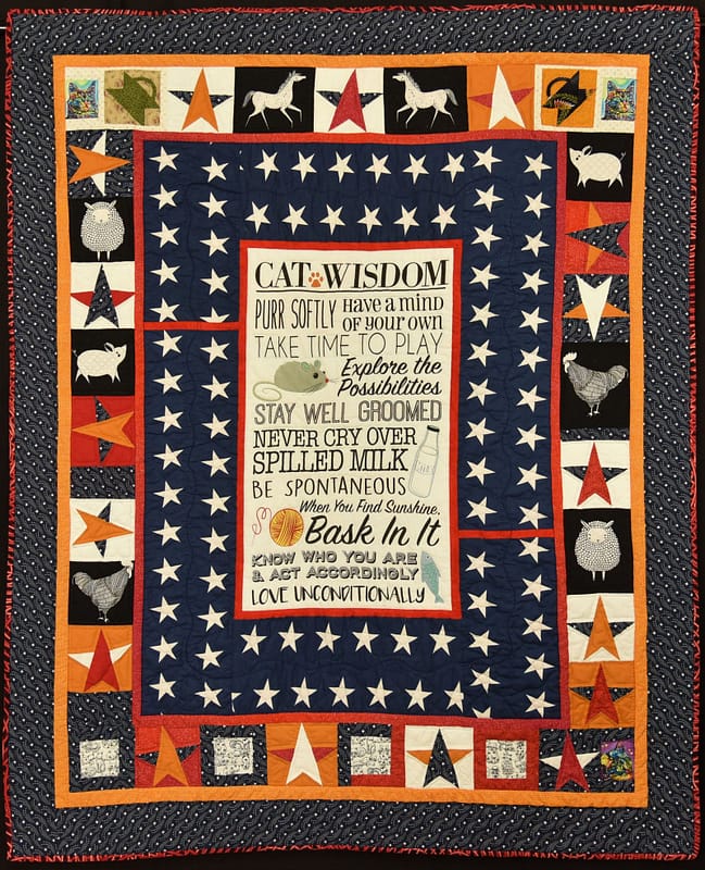 Description: Cat Wisdom was the name on a tea towel given to me as a gift by a neighbor. So of course, I made it into a quilt. I washed and trimmed the towel and hung it on my design wall and over time added to it. A design of a 5-pointed star caught my attention, so I took some time drafting this star made of two different colors and added several blocks to the quilt. When the piece was big enough for a quilt, I quilted it by machine and by hand. The backing is from pieces of fabric from my collection of animal fabrics.
