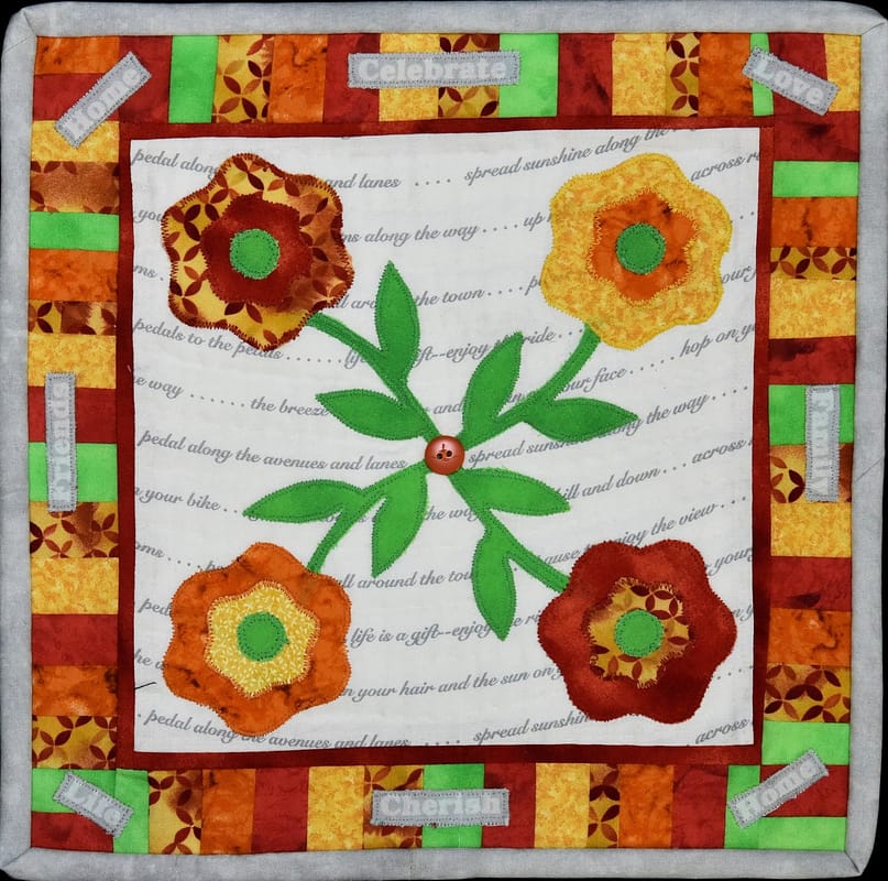 Description: This 12” X 12” quilt is called “The Chatting Posy“ for all the words in the background fabric. I used hand stitching, machine stitching and appliqué for construction. The older I get, the more grateful I become for the art of quilting. It has consumed many hours of my life. Whether it be talking about it, reading about it, or making a quilt, I am thankful for quilting.