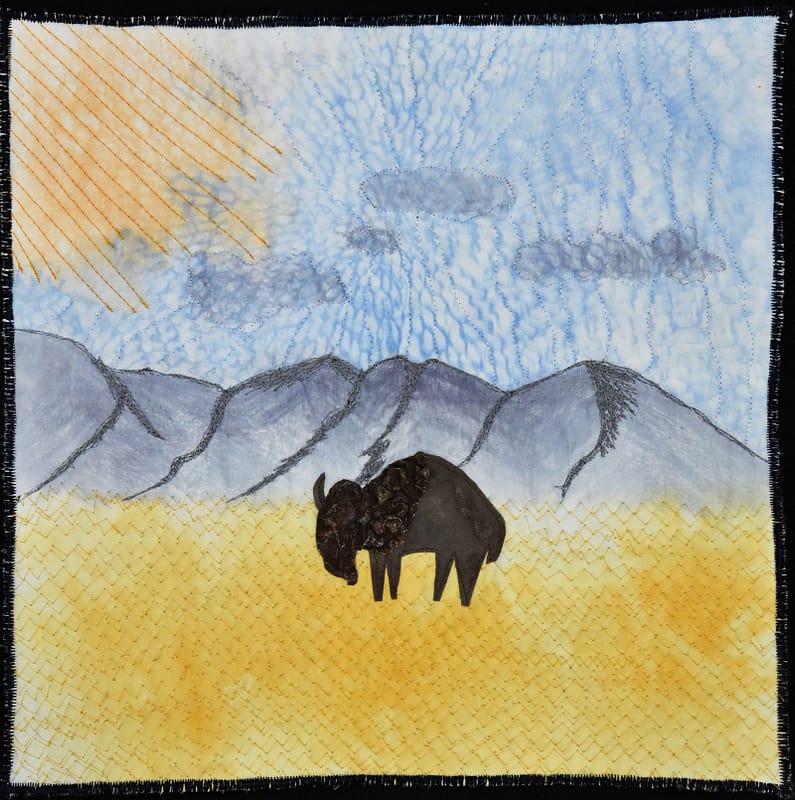 Description: I tried to instill the essence of the serene colors and feelings that this image of a buffalo against the backdrop of the mountains has imprinted in my mind. This art piece was created using disperse dye using stencils for patterns and thread painting. The buffalo is made from Tyvek and Evolon painted with acrylic paint.