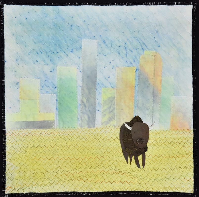 Description: The pristine image of a buffalo against the backdrop of downtown Denver feels surreal. I love the feeling of wildlife at our front door. This art piece was created using disperse dye using stencils for patterns and thread painting. The buffalo is made from Tyvek and Evolon painted with acrylic paint.