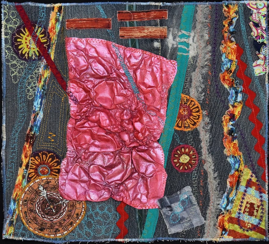 Description: I created this towards the end of the pandemic. I picked scraps and started sewing them onto a piece of denim. There is no order, there are no rules, and there definitely is no rhythm or reason as to why. The world is not the way it was, and I don't think it will return as such. I used denim, cotton fabric, ribbon, embroidery stitches and Tyvek.